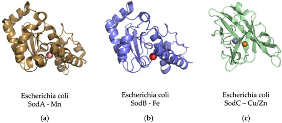 The adaptation of SOD proteins to different metal ions depending on their abundance. The SOD enzymes can convert the oxygen free radical (O2−) into hydrogen peroxide (H2O2) and water (H2O) [84]. (a) E. coli Mn-superoxide dismutase protein. MnSOD is very important to protect cells from the dangerous effects of overproduction of ROS [85]. It is a homotetrameric enzyme that has manganese at its active center to achieve an efficient O2 dismutation. (b) E. coli Fe-superoxide dismutase protein. Several works consider FeSOD as the oldest of this type of protein. This is because its emergence in primitive organisms is consistent with the high bioavailability of iron. It shares 42% of its identity with the MnSOD amino sequence [82]. (c) CuZnSOD proteins are known as the most modern family of the SOD lineages. These enzymes are present in Bacteria and Eukarya but not the Archaean domain, and for this reason, it is thought that this family is more recent than those of iron and manganese [82].
