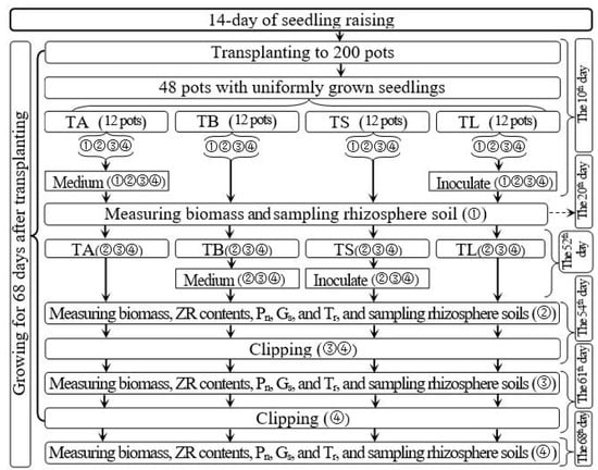 Uniform and vigorously growing seedlings were transplanted into 200 pots with six seedlings in each pot, and then the transplanted seedlings were placed in the sun and allowed to grow. On day 10 after transplanting, 48 pots with uniform and vigorously growing seedlings were randomly selected for the experiments. Figure 1 displays the treatment parameters, trial time course, and related indicators measured for the 48 pots. These 48 selected pots were divided into four groups of 12 pots each to investigate the effect of the AOB strain on Italian ryegrass regrowth following defoliation. These groups were subjected to one of four treatments: (1) regrowth with S2_8_1 strain inoculated relatively long before defoliation (TL), (2) regrowth with liquid medium without AOB added relatively long before defoliation (TA), (3) regrowth with S2_8_1 strain inoculated shortly before defoliation (TS), and (4) regrowth with liquid medium without AOB added shortly before defoliation (TB). The three pots in each subgroup were considered three replicates for each measurement of each treatment. The four subgroups in each treatment were randomly named subgroups 1, 2, 3, and 4.