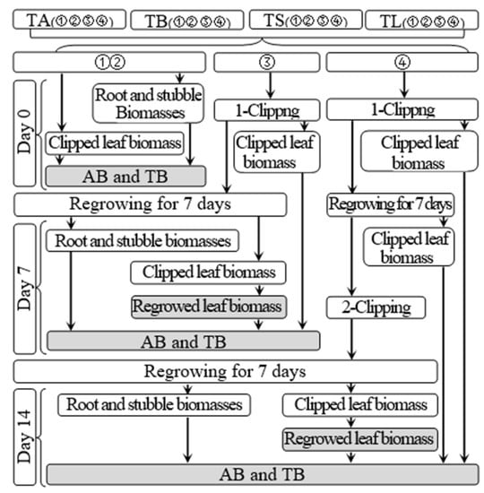 Schematic diagram for the measurement of biomass. TA, TB, TS, TL indicate treatments of regrowth with liquid medium without AOB added relatively long before defoliation, regrowth with liquid medium without AOB added shortly before defoliation, regrowth with S2_8_1 strain inoculated relatively long before defoliation, and regrowth with S2_8_1 strain inoculated shortly before defoliation, respectively. “①”, “②”, “③”and “④” show the first, second, third and fourth subgroups of each treatment, respectively. “day 0”, “day 7”, and “day 14”, respectively stand for the beginning, 7th day, 14th days of the 14-day regrowth period. “AB” and “TB” refer to accumulated aboveground and total biomasses, respectively.