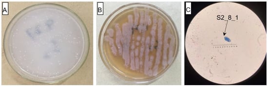 Cell and colonial morphology of strain S2_8_1 in the study. The S2_8_1 was the strain that has been isolated and screened in the present study. (A) and (B) Showed the morphology characteristics of cell and colony of strain S2_8_1 in separation and LB mediums, respectively. (C) Showed the size and sharp of strain S2_8_1, respectively.