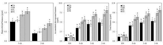 Biomass of Italian ryegrass in the different treatments in the experiment. TA, TB, TS, TL indicate treatments of regrowth with liquid medium without AOB added relatively long before defoliation, regrowth with liquid medium without AOB added shortly before defoliation, regrowth with S2_8_1 strain inoculated relatively long before defoliation, and regrowth with S2_8_1 strain inoculated shortly before defoliation, respectively. “b34”, “0-cli”, “1-cli” and “2-cli” mean, respectively, day 34 before defoliation, days 0, 7 and 14 after defoliation. Biomass refers to dry matter. The values are the mean ± standard error (n = 3). The different letters in each row indicate significant differences (p < 0.05).