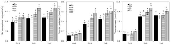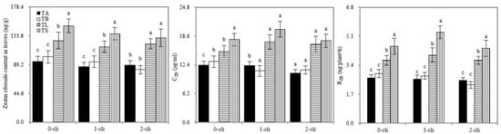 Net photosynthetic rate, transpiration rate, and stomatal conductance of Italian ryegrass in the different treatments in the experiment. TA, TB, TS, TL indicate treatments of regrowth with liquid medium without AOB added relatively long before defoliation, regrowth with liquid medium without AOB added shortly before defoliation, regrowth with S2_8_1 strain inoculated relatively long before defoliation, and regrowth with S2_8_1 strain inoculated shortly before defoliation, respectively. “0-cli”, “1-cli” and “2-cli” mean, respectively, days 0, 7 and 14 after defoliation. The values are the mean ± standard error (n = 3). The different letters in each row indicate significant differences (p < 0.05).