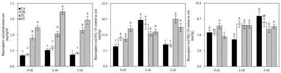 Rhizosphere soil nitrification rate, rhizosphere soil ammonium and nitrate nitrogen contents of Italian ryegrass in the different treatments in the experiment. TA, TB, TS, TL indicate treatments of regrowth with liquid medium without AOB added relatively long before defoliation, regrowth with liquid medium without AOB added shortly before defoliation, regrowth with S2_8_1 strain inoculated relatively long before defoliation, and regrowth with S2_8_1 strain inoculated shortly before defoliation, respectively. “0-cli”, “1-cli” and “2-cli” mean, respectively, days 0, 7 and 14 after defoliation. The values are the mean ± standard error (n = 3). The different letters in each row indicate significant differences (p < 0.05).