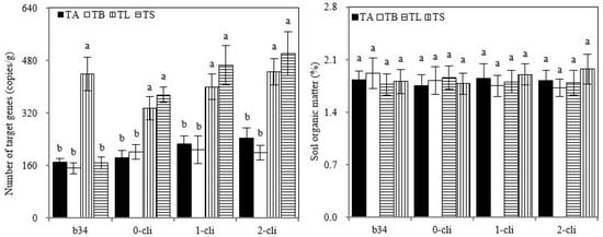 S2_8_1 number in rhizosphere soil and soil organic matter in the study. TA, TB, TS, TL indicate treatments of regrowth with liquid medium without AOB added relatively long before defoliation, regrowth with liquid medium without AOB added shortly before defoliation, regrowth with S2_8_1 strain inoculated relatively long before defoliation, and regrowth with S2_8_1 strain inoculated shortly before defoliation, respectively. “b34”, “0-cli”, “1-cli” and “2-cli” mean, respectively, day 34 before defoliation, days 0, 7 and 14 after defoliation. The values are the mean ± standard error (n = 3). The different letters in each row indicate significant differences (p < 0.05).