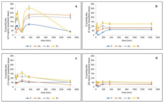The highest amounts of Eu3+ removed were 447.23 ± 38.51 µmol/g at the lowest biosorbent dosage and after 30 min (Figure 2a). The highest amounts removed of cerium were 214.03 ± 19.58 µmol/g at the biosorbent dosage 2.5 mg/mL (Figure 2a). Even at pH 4.5, the best removal rates were recorded at 2.5 mg/mL; terbium (621.16 ± 5.21 µmol/g of Tb3+) was the element most absorbed by the algae, followed by europium, yttrium, and cerium (terbium > europium > yttrium > cerium).