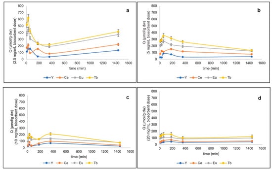 Even at pH 4.5, for all metals the highest removal rates were obtained at the lowest dosage of biosorbent but in a shorter time, i.e., after 30 min of contact (Figure 2, Table 1). The total metal recovery reached 1440.50 ± 136.87 µmol/g at 2.5 mg/mL; by doubling biomass, the total metal uptake progressively halved. The highest amounts of Tb3+ removed (621.16 ± 5.21 µmol/g) were obtained after 30 min at 2.5 mg/mL (Figure 2a).