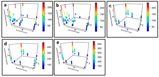 The interactions among variables were evaluated using a 3D scatter plot surface (Rstudio) (Figure 3a–e). As shown in Table 2, p values of the factors biomass, pH, and time did not have the same statistical significance for each metal. For yttrium recovery, only biomass (biosorbent dosage) influenced its biosorption (p < 0.05) by G. sulphuraria; in contrast, the p values of pH, biosorbent dosage, and time were all lower than 0.05 for cerium, europium, and terbium, indicating that these variables significantly influenced the biosorption. The p values of interaction terms pH–biosorbent dosage and pH–time were both lower than 0.05 for europium and terbium, thus suggesting the influence of the interaction between these two terms on the adsorption capacity of the two metals. Cerium adsorption was affected by the interaction terms pH–time, with the p value being significantly lower than 0.05.