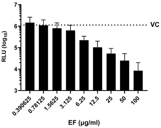 Inhibition of SARS-CoV-2 pseudoparticle infectivity by EF extract. Serial dilutions of EF extract were incubated with SARS-CoV-2 pseudoparticles for 1 h showing a dose-dependent inhibition of SARS-CoV-2 infectivity as measured by intracellular luciferase expression in mean relative light units (RLU). VC represents the RLU value of SARS-CoV-2 pseudoparticles-infected untreated cells. Data represent mean values ± standard deviations from three independent experiments performed in quadruplicates per experiment.