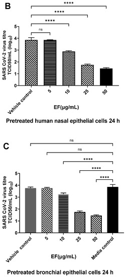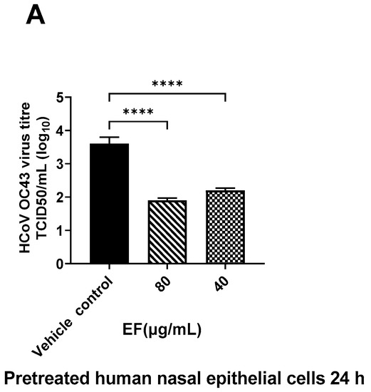 Primary human nasal epithelial cells (HNEpC) and primary human bronchial epithelial cells (HBEpC) were purchased from PromoCell GmbH, Germany, and MatTek Inc, USA, respectively. HNEpC and HBEpC cells were seeded (1 × 104/well) in 12-well plates and cultured in growth media free of antibiotics until 70% confluency was attained. Cells were pretreated with increasing concentrations of EF (5 to 80 µg/mL), and untreated wells received media alone or media with 0.2% ethanol for 24 h. After 24 h, supernatant was removed, cells were rinsed with PBS and infected with OC43 or SARS-CoV-2 at the MOI of 1 and incubated for 72 h at 34 °C and 37 °C, respectively, in 5% CO2; CPE was monitored microscopically. For infectious viral titer analysis, at 72 h post infection (hpi), cells were scraped from each well and collected with supernatant, and viral titer was determined on HCT-8 or Vero-E6 cells. Briefly, one day prior to infection, HCT-8 or Vero-E6 cells were seeded in 96-well plates at 1 × 104 per well. Samples were serially diluted 2-fold with specific culture media containing 2% FBS and transferred to HCT-8 or Vero-E6 cells, in 6 parallel wells (100 µL/well) and incubated for 72 h. CPE was observed, recorded, and TCID 50/mL was calculated for each sample. The cytotoxicity of EF was tested in parallel on uninfected cells using the MTS assay (Promega).