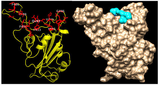 Herbal medicinal products typically contain a variety of pharmacologically active substances and in a first approach, several potentially active pharmacological substances were investigated for their interaction with well-known viral and cellular proteins in-volved in SARS-CoV-2 infection. Therefore, various alkylamide derivatives, caftaric acid, and 2-0-feruoyl-tartaric acid (totally 17 compounds) were tested for their docking potential against 12 different target proteins of SARS-CoV-2 virus (3CLpro, PLpro, RdRp, S-protein, NSP9, NSP13-16) and human cell proteins (ACE2, TMPRSS-2, and JAK2). The structure of the S protein and its receptor-binding domain (RBD, shown in red color) is represented in Figure 4. The RBD of the S protein contains, i.e., 18 amino acid residues (K417, G446, Y449, Y453, L455, F456, A475, F486, N487, Y489, Q493, S494, G496, Q498, T500, N501, G502, Y505). Looking at the surface of the S protein, the active region of the protein has a cave-like domain, allowing ligands to adapt and fit into this domain (as shown in Figure 4).