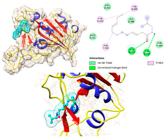 The binding affinities of all 17 compounds towards 12 different target proteins of SARS-CoV-2 virus are shown in Table 1. For the compound dodeca-2E,4E,8Z,10E-tetraensaure-isobutylamid belonging to the alkylamide group, a higher binding energy of −7.6 kcal/mol with the S protein was identified. This is depicted in Figure 5, which shows the hydrogen bonding interaction with the residues Gln 493 and Ser 494, Pi-Alkyl interaction with Tyr 453, Tyr 495, and Tyr 505, and van der Waals interaction with residues Arg 403, Tyr 449, Gly 496, and Asn 501.