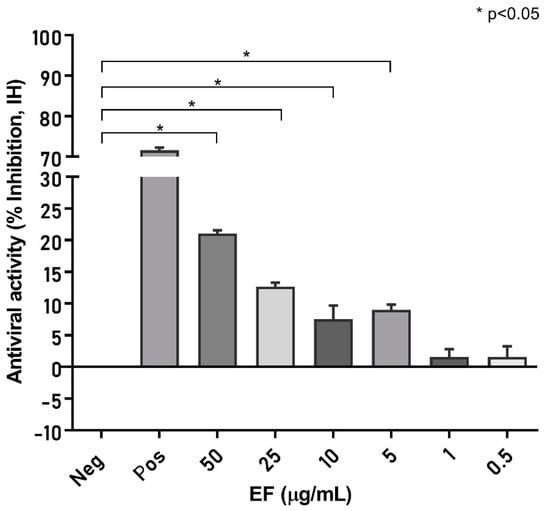 EF affects S protein binding to ACE2 receptor. S protein (RBD)-coated ELISA plates were incubated with increasing EF concentrations and subsequently the binding of biotinylated ACE2 receptors was quantified by measurement of chemiluminescence (% Inhibition, IH). As a positive control, ACE2 was co-incubated with immunized patient sera, which inhibited more than 71.5% of ACE2 receptor binding. EF at 50 µg/mL inhibited S protein binding, up to 21.0% to ACE2 (p < 0.05).
