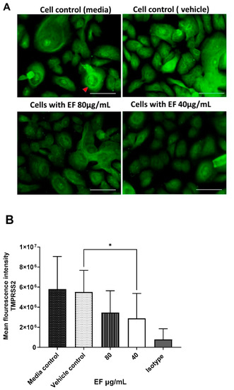 Inhibitory effect EF on TMPRSS-2 expression in EF pretreated HNEpC cells. Cultured HNEpC cells were treated with 80 and 40 µg/mL EF for 48 h. (A) Surface and intracellular immunofluorescent staining using an TMPRSS-2 antibody. (B) Quantification of the TMPRSS-2 signal. Graphs represent mean inflorescence values and ± SD of three independent experiments (* p < 0.05). Fluorescent intensity was calculated using Imagej software package (open source). Scale bar = 100µm.