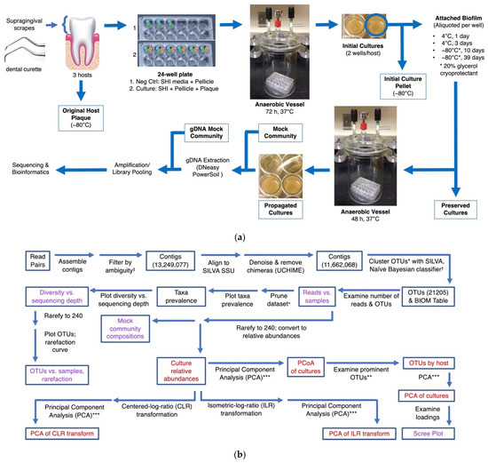 Experimental design and bioinformatic analysis. (a) Experimental scheme for preservation and propagation experiments; blue boxes around text indicate samples that were analyzed. Negative controls and host cultures were grown in separate plates to minimize cross-contamination, and samples not used for downstream culturing were flash-frozen in 20% glycerol and stored at −80 °C until further processing. Attached and/or sedimented cells in each well were divided into five aliquots, four of which underwent a preservation type and one that was reserved for later analysis. (b) Bioinformatics pipeline and statistical analyses. The SILVA SSU referenced here is the non-redundant database (version 132). Purple: figures with quality-control results; red: figures included in the final results of bioinformatics analysis. * 3% dissimilarity; ** analysis only includes OTUs with relative abundances greater than 0.1%; *** analysis includes OTUs with relative abundances greater than 0.1% (after rarefaction), cultures only. † 80% pseudo-bootstrap; ‡ reads with ambiguously assigned bases are filtered out at this step. + Prune out all controls and plaque samples, samples with <1000 reads, and one outlier (more than 700,000 reads).