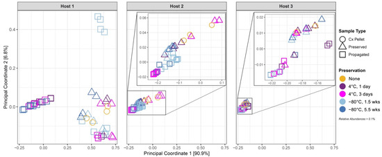 Principal coordinate analysis (PCoA) with Bray–Curtis dissimilarity distances [70] was used to visualize similarities and differences in community compositions (Figure 3). The first two principal coordinates accounted for more than 97% of the total variation in the samples. Interestingly, all cultured, preserved, and propagated samples from Host 2 and Host 3 formed a cluster at the same location, although Host 2 samples clustered less tightly than Host 3 samples. In stark contrast, samples from Host 1 formed multiple clusters (including one overlapping the cluster of Hosts 2/3). Of the Host 1 clusters, two clusters—one containing some of the propagated cultures and the other containing the initial and preserved cultures—showed distinct compositions compared to Hosts 2/3. The third cluster in Host 1, containing most of the propagated cultures, overlapped the region occupied by Hosts 2/3. This indicates that propagation led to a shift in community composition toward the Hosts 2/3 state. This composition thus appears to act as an “attractor” state as an initially diverse community undergoes in vitro culturing, preservation, and propagation. Indeed, while Host 2 showed some dispersion in compositions compared to Host 3, the propagated samples of Host 2 clustered more tightly at this “attractor” state (PC1 at approximately −0.2) compared to the other samples. Samples from Host 1 showed that initial cultures, and cold preservation without propagation, did not produce communities with the “attractor” composition. Differences in preservation conditions did not clearly translate into compositional differences. In addition, for Host 1, as noted above, some propagated replicates gave distinct compositions. Overall, the PCoA revealed an “attractor” composition, and propagation tended to shift the community toward this composition.