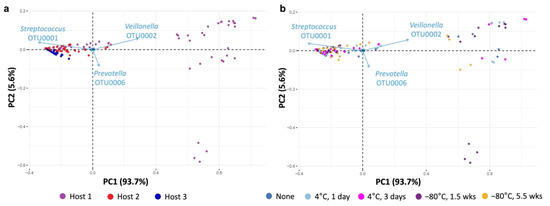 PCA biplots of relative abundances, by host (a) or preservation condition (b). Each dot represents a single sample (see legend). Arrows depict major OTUs in the dataset. Note the presence of a cluster of diminutively short arrows near the origin, containing OTUs that do not contribute substantially to the variation in the dataset. Dimension 1: Streptococcus OTU001 (–), Veillonella OTU002 (+); Dimension 2: Prevotella OTU006 (–), Veillonella OTU002 (+), Streptococcus OTU001 (+).