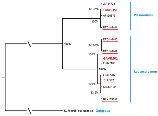Molecular phylogenetic analysis by Maximum Likelihood Bayesian Analysis, based on parasite DNA sequences (479 bp cyt b fragment). Posterior probabilities of the nodes are shown. Genus names of parasites are indicated in blue, MalAvi lineage names are included in red letters and parasites from red-throated diver samples are given with bird IDs, indicated in black and underlined red. Reference sequences are indicated in black and not underlined. Details of the reference sequences, including blood parasite and host species identity and code and location, are given in Table 2.