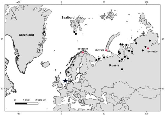 The breeding regions of red-throated divers in this data set were identified by additional analysis of tracking data and were located in Greenland, Svalbard, Norway and northern Russia, see Kleinschmidt et al. [40], (Figure 2). The breeding regions of two individuals, one (ID 146445) infected with Leucocytozoon and one (ID 146441) that showed a heterogenic infection with Leucocytozoon and Plasmodium, could not be assigned due to the early mortality of these individuals.