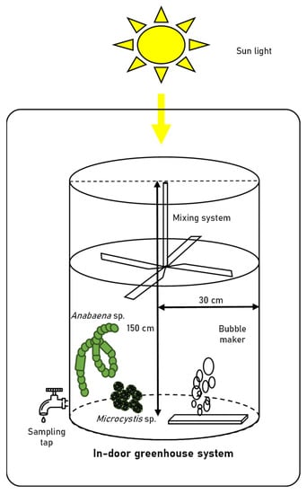 Anabaena sp. and Microcystis sp. were cultivated in a 60 cm (diameter) × 150 cm transparent acrylic tank containing 100 L of BG-11 medium (diluted 5-fold) in an indoor greenhouse. The nitrogen source comprised 300 mg/L of NaNO3 and 1.2 mg/L of Ferric ammonium citrate in BG-11 medium. The acrylic tanks were covered tightly with a blue-light filter and/or green-light filter (Figure 1). Acrylic tanks were composed of a paddlewheel system to prevent cell settling, and an air sparger (1000 cc/min). The initial seed cultures of Anabaena sp. and Microcystis sp. were grown in a 2-L mini-column until the cell density of both strains had reached approximately 1.0 × 105 cells/mL and were subsequently inoculated into four different light conditions. The composition of cyanobacteria and their associated bacterial assemblages in the tanks were observed for 15 days. The environmental parameters expected to affect the microbial communities were measured during the experimental period. The spectral composition of natural light was monitored using a portable spectrometer (LI-180, LI-COR, Lincoln, NE, USA) in 1 nm wavelength intervals with a 12 nm bandwidth thrice a day (9 am, 1 pm, and 5 pm) for 15 days. The water temperature, dissolved oxygen (DO), conductivity, pH, and turbidity were recorded during the experimental period using a ProDSS Multiparameter Water Quality Meter (YSI Inc., Yellow Springs, OH, USA). The total nitrogen (TN), total phosphorus (TP), biochemical oxygen demand (BOD), chemical oxygen demand (COD), nitrite (NO2−), nitrate (NO3−), ammonia (NH3), and orthophosphate (PO43−) levels were measured according to standard procedures [18].