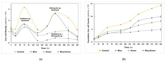 Among the cyanobacteria, Anabaena sp. showed the maximal cell density at 72 h under all conditions examined (Figure 2a), whereas the growth of Microcystis sp. was predominantly observed in the control (i.e., natural light condition) and blue (i.e., blue-light filtered condition) conditions in the second live-cell increment phase at 240 h (Day 10, Figure S2f). The control condition reached 3.1 × 106 cells/mL, whereas the other conditions exhibited live-cell density values below 1.5 × 106 cells/mL at 72 h. The total cumulative live-cell density in each cultivation was highest in the control condition (1.43 × 107 cells/mL), followed by the blue, green, and dark conditions (4.9 × 106 cells/mL) (Figure 2b).