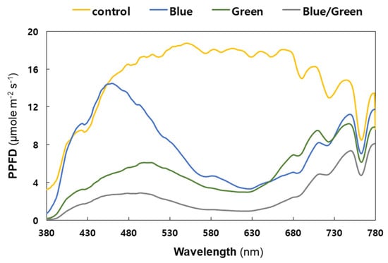 Spectral composition of light under the experimental conditions (Yellow: control, Blue: blue film, Green: green film, Grey: blue and green films). X-axis: wavelength; y-axis: photosynthetic photon flux density (PPFD). The PPFD units were measured in 1 nm wavelength intervals with a 12 nm bandwidth. Each measurement was taken thrice and the values were then averaged.