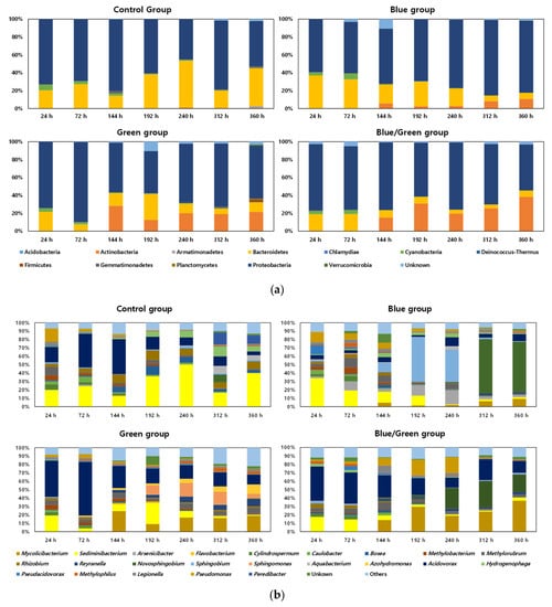 The relative abundances of bacterial communities under the four experimental conditions are shown in Figure 4. Proteobacteria and Bacteroidetes were the major phyla in the control condition, whereas Proteobacteria, Bacteroidetes, and Actinobacteria were the major phyla under the other conditions (Figure 4a). The phylum Actinomycetes was found to increase at 144 h under the three light-limited conditions, and the ratio of Actinomycetes in the dark condition reached 38% at 360 h. Moreover, Acidovorax and Sediminibacterium were the dominant genera in the control condition and showed a higher ratio at 144 h (41%) and 192 h (50%), respectively (Figure 4b). Sphingobium and Novosphingobium were the dominant genera in the blue condition at 192 h (53%) and 312 h (65%), respectively.