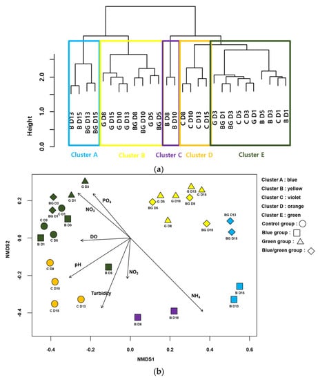 The CA classified the samples into five clusters (A–E) based on the similarities in the bacterial communities (Figure 5a). All samples from the control condition and the first two samples from the blue, green, and dark conditions were included in cluster E. All samples except the first two samples from the green condition were in cluster B. The last two samples from the blue and dark conditions were in cluster A. The NMDS also represented the differences in the bacterial communities and clusters from the CA (STRESS value = 0.072 for the first three axes) (Figure 5b). Samples with high values of NH3 were located on the lower-right side of the NMDS plot, whereas those with high values of NO3− and PO43− were located on the upper-left side of the NMDS plot. In addition, samples that showed lower growth of cyanobacteria were primarily located on the upper-right side of the NMDS plot (e.g., the samples from the dark condition).