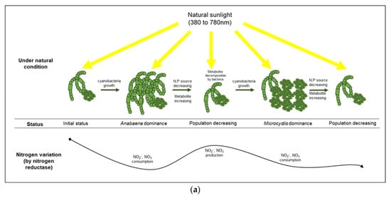 Two types of ammonia assimilation mechanisms are accomplished by nitrate reductase and nitrogenase. These nitrogen fixation processes can be performed by cyanobacteria themselves and/or bacterial assemblages in a phycosphere. Assimilatory nitrate reduction in cyanobacteria primarily occurs via nitrate reductase and nitrite reductase, which incorporates nitrate into amino acids and amides [37,38] for the constructive production of cells. The changes in the concentrations of nitrogenous compounds (i.e., TN, nitrate, and nitrite) under the control condition suggest that the cell growth of cyanobacteria under natural light systemically depends on the assimilatory nitrate reduction [39,40].