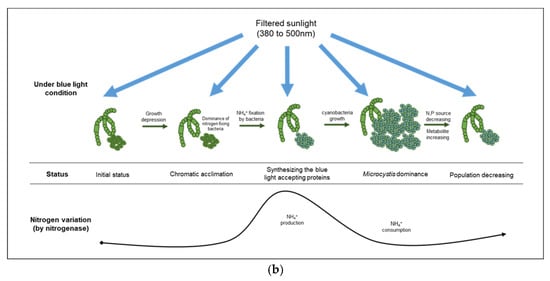 Comparison of cyanobacterial growth patterns under natural (a) and blue light-filtered (b) conditions. It was elucidated that a plausible interaction exists between cyanobacteria and their associated bacterial assemblages through nitrogenous metabolites.