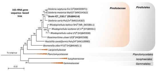 Phylogeny of strain ICT_E10.1T through the analysis of the 16S rRNA gene sequence. The maximum-likelihood tree evidences the proximity of strain ICT_E10.1T to the genus Stieleria within the family Pirellulaceae of the bacterial phylum Planctomycetota. GenBank sequence identifiers of other type strains are shown in parentheses. One thousand bootstraps were applied, and the respective values given at the nodes (in %). Branches of the other families in the class Planctomycetia collapsed at the family level. Three strains from the phylum Verrucomicrobiota were utilized as outgroups.