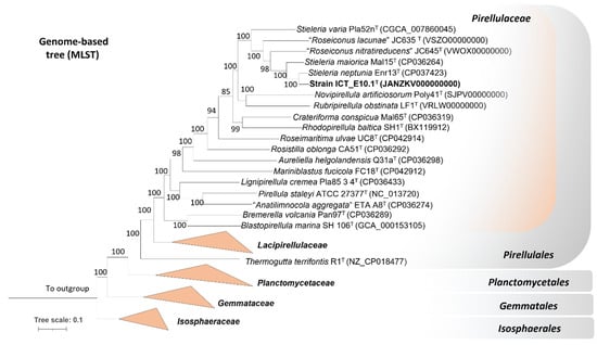 The analysis of the partial 16S rRNA gene sequence showed that strain ICT_E10.1T is affiliated with the genus Stieleria of the phylum Planctomycetota (Figure 1). This genus belongs to the family Pirellulaceae of the order Pirellulales and the class Planctomycetia. Based on the analysis of the full-length 16S rRNA gene sequence, the current closest validly described relatives of strain ICT_E10.1T are Stieleria neptunia Enr13T [52] (with 98.8% similarity), S. maiorica Mal15T [56] (98.4%) and S. varia Pla52nT [59] (95.8%). The threshold proposed for the delineation of novel species (98.7%) [81] is only slightly surpassed when compared with S. neptunia Enr13T. Nevertheless, the sole use of the 16S rRNA gene sequence was proved in various cases to be insufficient for inferring the phylogeny in the phylum. New planctomycete species with higher 16S rRNA gene sequence similarities (99.0–99.9%) were recently proposed based on the analysis of additional phylogenomic markers, including in the Stieleria genus [19,52,82,83]. All phylogenetic markers employed in this study support the affiliation of strain ICT_E10.1T to the genus Stieleria but as a separated species, as all values obtained (Table 1) are below the threshold values proposed for new species: 71.4–88.5% for ANI and 67.8–90.6% for AAI (threshold value for both is 95% [84,85]), 23.2–37.0 for dDDH (threshold value of 70% [73]) and 82.0–94.1% for the comparison of the rpoB gene sequence (species threshold value is 95.5% [71]). The genome-based taxonomic analysis conducted through the TYGS also supports that strain ICT_E10.1T forms a novel species within the genus Stieleria. The genome-based tree shows that strain ICT_E10.1T clusters near S. neptunia Enr13T but in a separate branch (Figure 2).