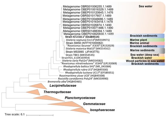 Strain ICT_E10.1T was isolated from sediments collected in the “Sea of Straw” bay in the Tagus river estuary (Portugal), a typical brackish environment. Deeper ecological evidence of strain ICT_E10.1T in other regions was obtained by searching for related Planctomycetota in the SILVA SSU database against the full-length 16S rRNA gene sequences available (release 138.1 from 27 August 2020) [41], considering hits with more than 98.7% similarity. At the present time, 56,166 sequences in the SILVA database are taxonomically assigned to the family Pirellulaceae and, out of these, ten metagenomes obtained from seawater showed phylogenetic proximity to strain ICT_E10.1T. The other type strains in the genus Stieleria were also all isolated from marine environments from different regions of the globe (Table 3). Furthermore, additional isolates that show proximity to the genus Stieleria include a strain isolated from a marine sponge collected in Moreton Bay (Australia) [87], a strain isolated from the deep sea [10], a strain isolated from brackish water samples and a strain obtained from a seawater/sediments mixture [88]. A phylogenetic tree was constructed to summarize the ecology of ICT_E10.1T-related Planctomycetota and other strains closely related to the genus Stieleria (Figure 3). In summary, strain ICT_E10.1T and its closest uncultured relatives appear to be associated with brackish and marine ecosystems and therefore adapted to tolerate salt, as well as the other members of the genus Stieleria and most Pirellulaceae (only two genera in the family are currently associated with freshwater environments: Pirellula and “Anatilimnocola” [18,47,89,90]).