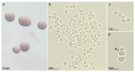 Phenotypic characterization of strain ICT_E10.1T while in exponential phase. Photographies of strain ICT_E10.1T in modified M14 medium (a) show its pink coloration and in bright field microscopy images (b–d) cells appear spherical to ovoid in shape and cluster in aggregates (b) or small chains (c). Budding is the division mode (d).