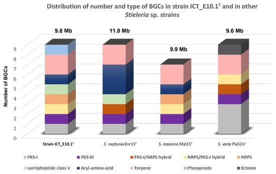 Distribution of number and structural types of BGCs putatively found in strain ICT_E10.1T and in its closest relatives S. maiorica Mal15T, S. neptunia Enr13T and S. varia Pla52nT for comparison, evidencing the content differences between strains. The genome size of each strain was additionally added above each bar.
