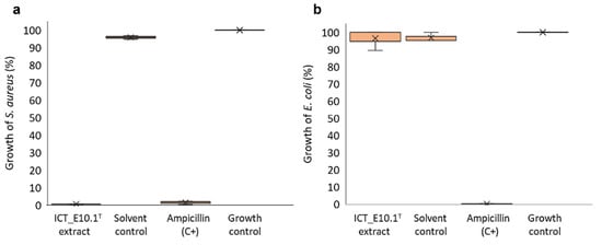 Boxplot diagram showing the percentage of growth of S. aureus (a) and E. coli (b) when exposed to ICT_E10.1T extract, considering the three biologically replicated assays. The solvent control corresponds to DMSO (2% v/v final concentration in the assay), the positive control of ampicillin (4 mg/mL final concentration in the assay), and the growth control of the target bacteria without exposure to treatments. The planctomycete extract consistently inhibited the growth of S. aureus in the three assays (a). In contrast, very low bioactivity was observed against E. coli (b).