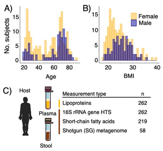 Two hundred and sixty-two individuals (men:women 90:172) with ages between 20 and 85 years (Figure 1A) and BMI ranging between 19 and 37 kg/m2 (Figure 1B) were included in this study. Subjects are representatives of community dwelling living in the Danish Capital Region. In this study, we included 1H NMR spectroscopy based quantified lipoproteins from human blood plasma [6], short-chain fatty acids profiling and GM composition on fecal samples based on 16S rRNA-gene amplicon sequencing and shotgun metagenome sequencing for a subset of samples (Figure 1C).