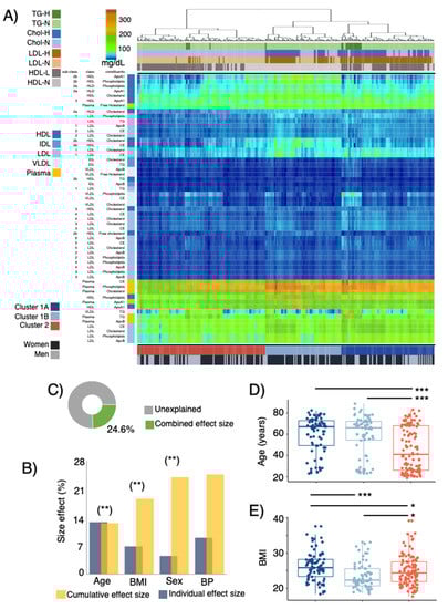 (A) Profiles of main and sub-fractions of plasma lipoprotein distribution (LPD) determined by 1H-NMR [6]. LPD are clustered using Euclidean distances and general agglomerative hierarchical clustering procedure. Upper color bars represent within-/out- of the recommended levels of main lipoprotein fractions suggested by the NIH [41] (total cholesterol < 200 mg/dL, LDL < 100 mg/dL, HDL > 60 mg/dL, Triglycerides < 150 mg/dL). Lower color bars depict 3 clusters (C1A, C1B and C2) of study participants given their LPD profile and the sex distribution of subjects. (B) Cumulative effect size of non-redundant covariates of LPD determined by stepwise RDA analysis (right bars) as compared to individual effect sizes assuming independence (left bars). (C) Fraction of LPD variation explained with the stepwise approach. Distribution of (D) age and (E) body mass index (BMI) between subjects belonging to C1A, C1B and C2. Stars show statistical level of significance (* p ≤ 0.05, ** p ≤ 0.01, *** p ≤ 0.001).