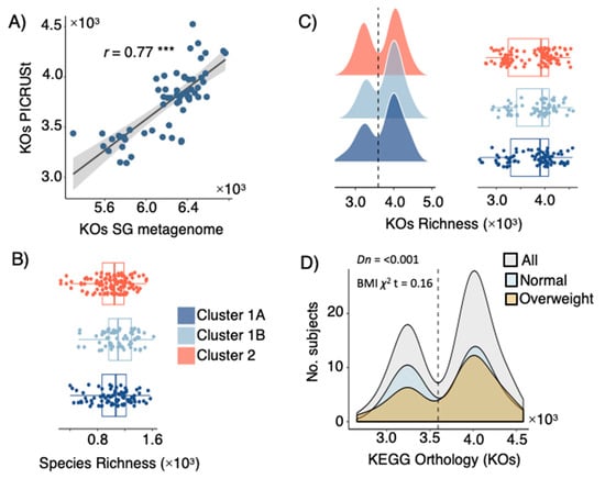 (A) Spearman’s rank correlation between fecal microbial KEGG Orthologues (KOs) from shotgun metagenome (SG) sequencing and KO predicted by PICRUSt. (B) Richness of microbial phylotypes (zOTUs) richness and (C) KO predicted by PICRUSt among subjects catalogued as being C1A, C1B and C2 based on their LPD. (D) KO counts (richness) among all subjects and those with BMI ≤ 25 (normal) and BMI > 25 (overweighed); the observed bimodal distribution was statistically significant by the dip-test. Stars show statistical level of significance (*** p ≤ 0.001).