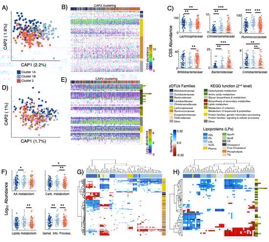 (A) Distance-based RDA (Canberra dissimilarity) displaying discrimination of LPD clusters based on selected zOTUs (p = 0.001, explained variance = 3.8%) and (D) KOs-PICRUSt (p = 0.001, explained variance = 2.7%) selected through Random Forests. (B) Overview of selected zOTUs and (E) KOs-PICRUSt clustered using Canberra distances and general agglomerative hierarchical clustering procedure based on ward2. (C) Distribution of zOTUs summarized to family level and (F) KOs-PICRUSt summarized to 2nd level KEGG function across subjects belonging C1A, C1B and C2 LPD groups. Heatmaps displaying significant (False Discovery Rate corrected, FDR ≤ 0.05) Spearman’s rank correlations between (G) zOTUs and LPD sub-fractions, as well as (H) KOs-PICRUSt and LPD sub-fractions. Stars show statistical level of significance (* p ≤ 0.05, ** p ≤ 0.01, *** p ≤ 0.001).