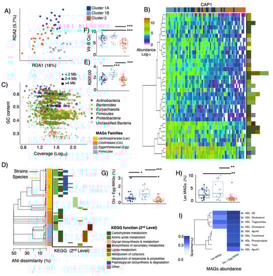 (A) RDA displaying discrimination of LPD clusters based on selected KOs obtained from shotgun metagenome and assembly (p = 0.001, explained variance = 23.7%). (B) Overview of most discriminatory (based on CAP1 and CAP2 within db-RDA) KOs with known metabolic functions clustered using Canberra distances and general agglomerative hierarchical clustering procedure based on ward2. (C) GC-content–Coverage plot of metagenome assembled genomes (MAGs) with ≤10% contamination and ≥70% completeness. MAGs are colored according to phylum-level taxonomic affiliation and bubble size indicates their genome size in mega-bases (Mb). (D) Phylogeny of MAGs containing KOs that discriminate LPD clusters (1A, 1B and 2), a cut-off of 95-ANI (species-level) and 99-ANI (strain-level) are denoted. MAGs are colored at family level affiliations and their KOs contribution at the 2nd level KEGG function pathways are provided. (E) Relative abundance of protein-encoding genes associated with butanol dehydrogenase (K00100), and (F) protein-encoding genes associated metabolism and biosynthesis of vitamin B1, B2, B5 and B9. (G,H) Cumulative abundance (RPKM) of MAGs affiliated to Clostridiales (Clo), Eggerthellaceae (Egg), and Lachnospiraceae (Lac) among LPD clusters. (I) Heatmaps displaying significant (False Discovery Rate corrected, FDR ≤ 0.05) Spearman’s rank correlations between MAGs abundance and HDL subfractions. Stars show statistical level of significance (* p ≤ 0.05, ** p ≤ 0.01, *** p ≤ 0.001).