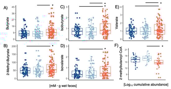 Concentrations of fecal (A) butyrate, (B) 2-methylbutyrate, (C) isobutyrate, (D) isovalerate, (E) valerate concentrations within the different LPD clusters. (F) Cumulative abundance 2-methylbutanoyl-CoA genes screened on metagenomes within LPD clusters. Stars show statistical level of significance (* p ≤ 0.05).