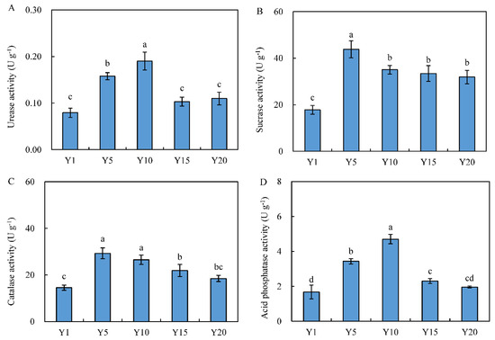 Soil enzyme activities in soil under different planting years of water oat. (A) Urease. (B) Catalase. (C) Sucrase. (D) Acid phosphatase. Y1: soil from water oat planting for 1 year. Y5, Y10, Y15 and Y20: soil from continuous water oat replanting for 5, 10, 15 and 20 years, respectively. Different letters indicate significant differences among the treatments at the p < 0.05. The error bars indicate the standard error of the means (n = 3).
