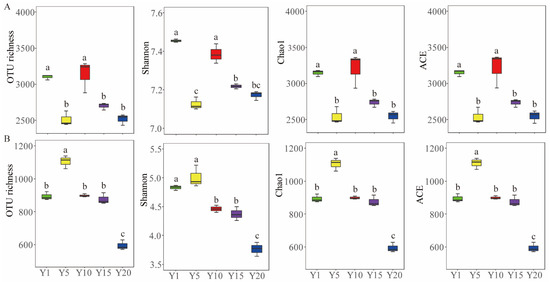 Alpha diversity indices of bacterial (A) and fungal (B) communities in soil under different planting years of water oat. Y1: soil from water oat planting for 1 year. Y5, Y10, Y15 and Y20: soil from continuous water oat replanting for 5, 10, 15 and 20 years, respectively. Different letters indicate significant differences among the treatments at the p < 0.05. The error bars indicate the standard error of the means (n = 3).