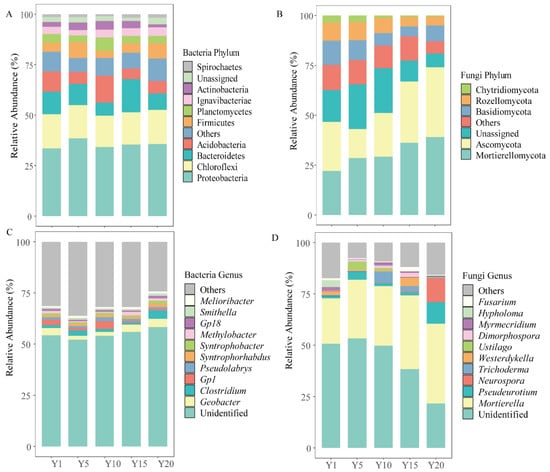 Relative abundances of bacterial and fungal taxa at the phyla (A,B) and genera (C,D) levels in soil under different planting years of water oat. Y1: soil from water oat planting for 1 year. Y5, Y10, Y15 and Y20: soil from continuous water oat replanting for 5, 10, 15 and 20 years, respectively.
