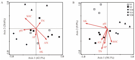 Redundancy analysis of soil properties and community composition of bacteria (A) and fungi (B). SOC: soil organic carbon; TN: total nitrogen; AN: alkali−hydrolyzable nitrogen; AP: available phosphorus; AK: available potassium. Y1: soil from water oat planting for 1 year. Y5, Y10, Y15 and Y20: soil from continuous water oat replanting for 5, 10, 15 and 20 years, respectively.