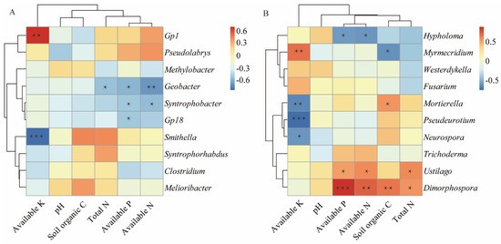 Heatmap of the Spearman correlation analysis between soil variables and the 10 most dominant bacterial (A) and fungal (B) genera. * p < 0.05. ** p < 0.01. *** p < 0.001.