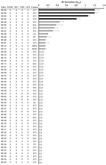 Biofilm-forming capacities and drug susceptibilities of E. coli clinical isolates. Black, gray, and white bars indicate high-capacity (A550 > 0.8), low-capacity (A550 0.1–0.8), and non-biofilm-forming strains (A550 < 0.1), respectively. Measurements were performed three times, and the data shown are the means ± standard deviations. Antimicrobial drug susceptibilities from left to right: meropenem (MEPM), cefmetazole (CMZ), ceftriaxone (CTRX), and levofloxacin (LVFX) of planktonic E. coli cells; the primary diseases are shown next to the strain numbers. AC, acute cholangitis; AOSC, acute obstructive suppurative cholangitis; AP, acute prostatitis; CBDC, common bile duct calculi; Cho, cholecystitis; LA, liver abscess; PS, pyogenic spondylitis; Unk, Unknown; UTI, urinary tract infection. S, susceptible; R, resistant. The drug susceptibilities of planktonic E. coli cells were performed following the Clinical and Laboratory Standards Institute (CLSI) M100-Ed31 protocol. A550 of negative controls without antimicrobial agents was 0.06 (range: 0.055–0.087).