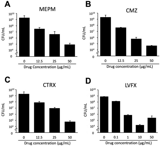 Drug susceptibilities of an E. coli RB-3 biofilm to four antibacterial agents. A high-capacity biofilm-forming strain, RB-3, was grown under biofilm-forming conditions for 24 h. Various concentrations of MEPM, CMZ, CTRX (0, 12.5, 25, and 50 μg/mL), and LVFX (0, 0.1, 1.0, 10, and 50 μg/mL) were added followed by incubation at 37 °C for 24 h (A–D). The wells without drugs (0 μg/mL) were used as controls. Then, the viable cells were counted. The data are the means ± standard deviations of three measurements. MEPM, meropenem; CMZ, cefmetazole; CTRX, ceftriaxone; LVFX, levofloxacin. Statistically significant differences between groups were evaluated using the Kruskal–Wallis test; p < 0.05. The p-value of each figure was less than 0.05.