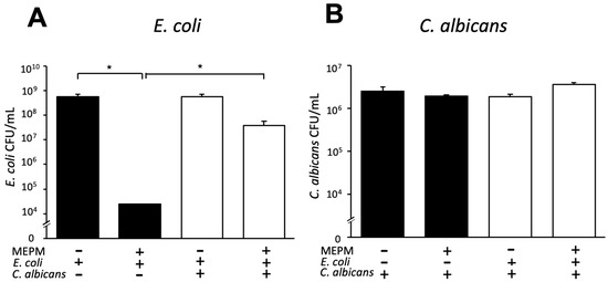 Antimicrobial effects of MEPM against a dual-species biofilm with E. coli and C. albicans. (A) Survival of E. coli RB-3 in single (black) and dual-species (white) biofilms treated with or without MEPM (50 µg/mL); only E. coli was quantified using a selective medium containing micafungin. (B) Survival of C. albicans in single (black) and dual-species (white) biofilms treated with or without MEPM (50 µg/mL); only C. albicans was quantified using a selective medium containing streptomycin. Measurements were performed three times, and the data are the means ± standard deviations. n = 3/group. Statistically significant differences between groups were evaluated using Tukey’s test with one-way ANOVA; * p < 0.05.