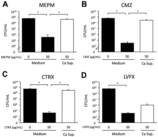 Effect of C. albicans culture supernatant on E. coli biofilm formation in the presence of antimicrobial agents. E. coli RB-3 survival in the presence of Candida culture supernatant (Ca Sup.) and 0 or 50 μg/mL MEPM, CMZ, CTRX, or LVFX (A–D). Measurements were performed three times, and the data are presented as the mean ± standard deviation. n = 3/group. Statistically significant differences between groups were evaluated using Tukey’s test with one-way ANOVA; * p < 0.05.